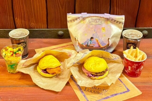 ▲メニューは、お店の看板のアヒルをイメージした黄色いバンズの、食べごたえ満点な全4種のハンバーガー。ビーフにベーコンを合わせたパティとボロニアソーセージの2種をはさんだ「ダックリングドリームバーガー」(単品¥900)、そこにチーズがはさまれた「ダックリングドリームチーズバーガー」(単品¥950)、しっぽの付いた大きなエビフライを豪快にはさんだ「フライドシュリンプバーガー」(単品¥950)、エンドウ豆のパティとゆず味噌を加えたソースのコクがありつつもさわやかなプラントベースのタルタルの「プラントベースバーガー」(単品¥950)です。単品はもちろん、サラダかフレンチフライポテトとソフトドリンクが付いたセットもあります。さらに、対象のメニューやセットには、ランタンフェスティバルでのロマンティックなボートの旅をイメージしたデザインのスーベニアランチケースをプラス¥1,300でつけることもできます。
