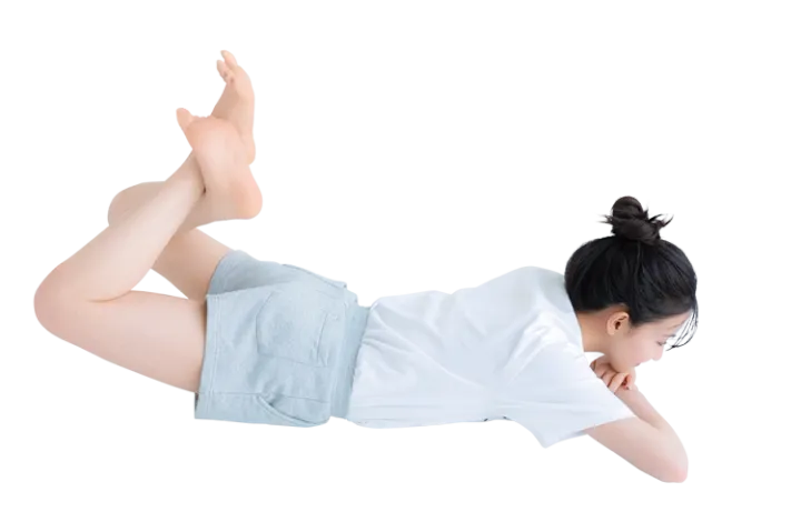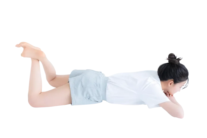 うつぶせになって両手をあごの下に重ねる。ひざを横に開き、足首はクロス。上半身は楽にして、恥骨を床につけたまま骨盤をキュッと持ち上げ3秒キープ。ゆっくり下ろすを30秒繰り返すだけ。1日10回をめざそう!