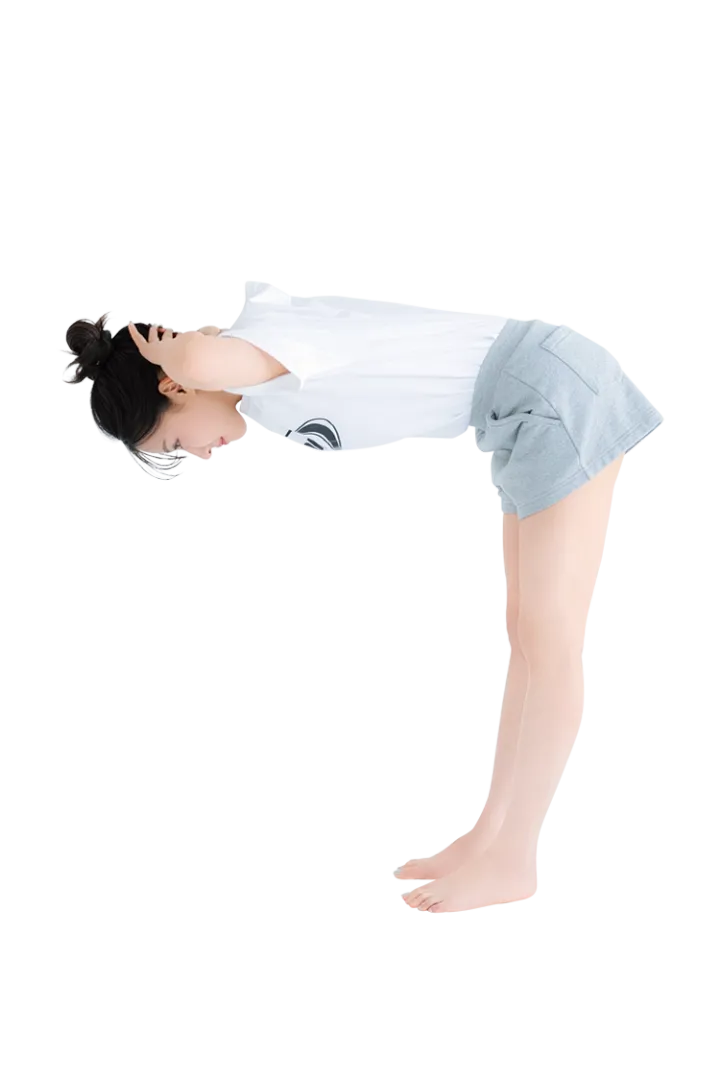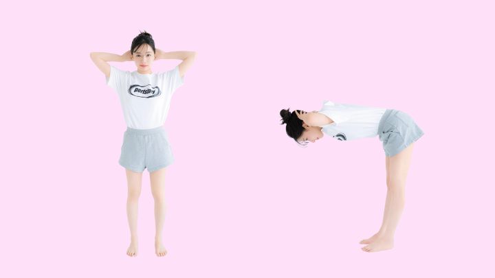 足を腰幅に開いてまっすぐ立ち、両手を耳の後ろに。ひじが耳の真横にくるようにセット。股関節から体を前に倒し、体を床と並行に。ももやひざ裏がのびたら2~3秒キープ。これを30秒繰り返します。