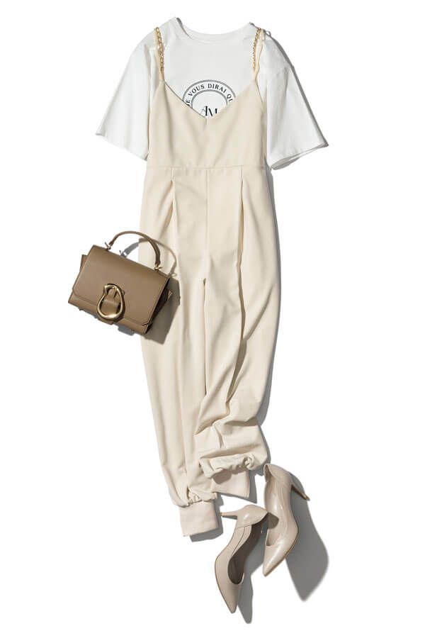 ロゴTシャツ¥3,960/NATURAL BEAUTY BASIC オールインワン¥16,500/ココ ディール バッグ¥14,300/ル・ベルニ(キャセリーニ) パンプス¥17,050/ダイアナ(ダイアナ 銀座本店)
