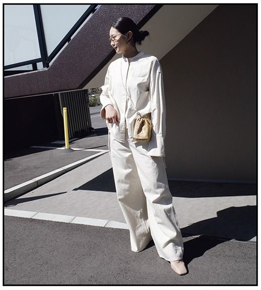 「日々、仕事でたくさんの新しい服とかかわるけれど、自分のワードローブテーマは、トレンドレスでエイジレスな「永く愛せるもの」。ヴィンテージ品を解体して再構築されたNUITのバッグは、個性的ながらも洗練された見た目が好きです。小ぶりなサイズなので、バッグINバッグとして使う日も。」(M_コミュニケーター/南ひかりさん)