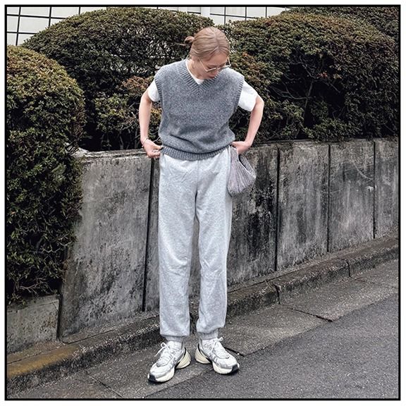 「キラキラしたものをこよなく愛しているので、バッグでもとり入れたくて購入。メンズっぽい服が多い反面、女っぽさも欲しいので“小さくキラキラ”なこのバッグはまさに効果てきめん。グレー縛りのシンプルな装いにとけ込むなじみのよさで、スエットスタイルをキャッチーに盛り上げてくれます。」(フリーランス/福本愛未さん)