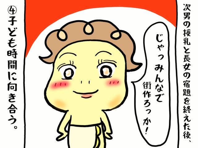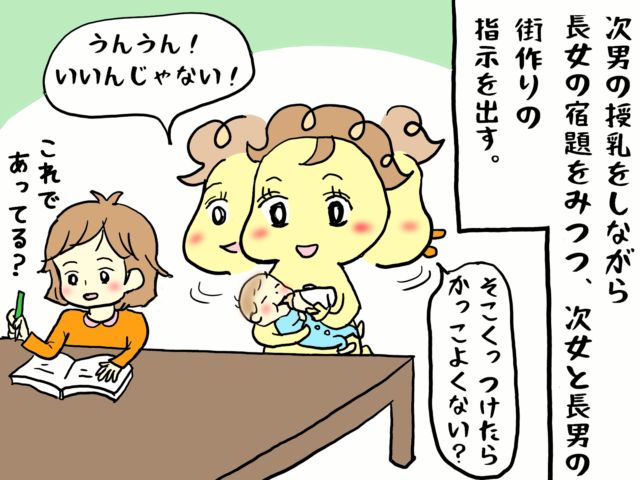 次男の授乳をしながら、長女の宿題をみつつ、次女と長男の街づくりの指示を出すことに。
