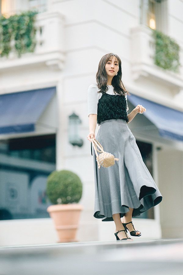 ニット¥8,250/Noëla キャミソール¥4,939/VIS スカート[セットアップ] ¥21,890/And Couture(And Couture ルミネ新宿店) ピアス¥3,300/スリーフォー タイム(ジオン商事) バッグ¥69,300/ルナイン/ルル・ウィルビー(アルアバイル) 靴[5月下旬入荷予定]¥20,900/銀座かねまつ(銀座かねまつ6丁目本店)