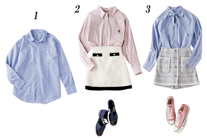 3.ブルーのストライプが爽やかなボウタイシャツは、 ややオーバーサイズで華奢見えに一役買ってくれる。同系のブルーがかったツイードミニスカとの 相性もバッチリ。ピンクの厚底コンバースで遊びゴコロをひとさじプラス&しれっと底上げしてスタイルアップを。