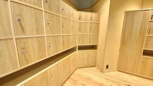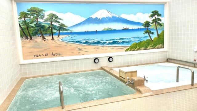 ロッカースペースは木製で、ドライヤーも昔ながらの20円入れるスタイル。浴室は小杉湯のこだわりでもある清潔感のある白タイルで、毎日心を込めて磨き上げています。浴槽は熱湯と水風呂に、小杉湯名物の「ミルク風呂」の3つ。壁面には富士山が描かれています。