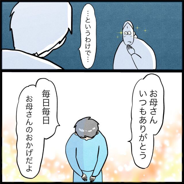 なんて素晴らしい教訓なんだ!と感激してしまったが、マジマジと改まって「ありがとう」と言われると、母は泣かずにはいられませんでしたね。