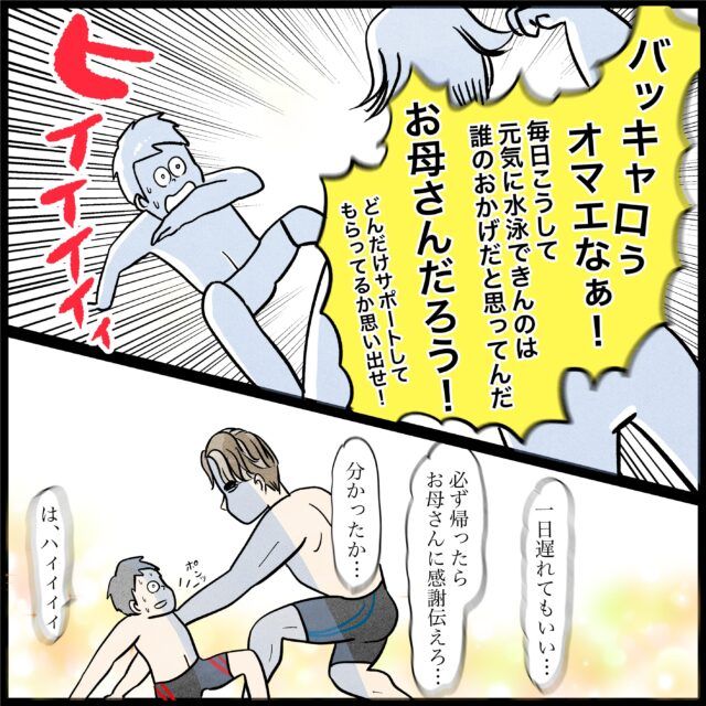 日頃、コーチから「礼儀がなってない奴はいくら練習したって速く泳げるようにならないぞ」と教えられている長男。