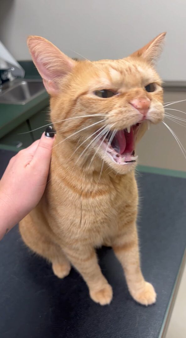 動物病院にやって来た子ネコ。 歯を見せた厳しい顔をしていますが、なにを警戒しているというのでしょうか?