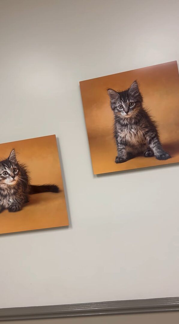 子ネコが「シャー!」と威嚇するように口を開きました! どうやら、壁に飾られている猫の写真に警戒しているみたいです。