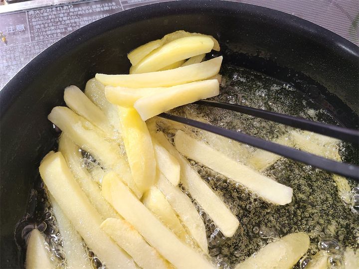 秘訣はいくつかありますが、何といっても「冷凍庫で一度冷やす」ことですよね。これは初めての工程でした。冷凍で売っているフライドポテトは買って揚げたことはありますが、じゃがいもを自分で切って作るときは冷凍はしていませんでした。冷凍庫で冷やして水分飛ばしているのでカリっと仕上がるそうなんです!勉強になりますよね♪それから、切ったじゃがいもをしっかりと水に浸してじゃがいもの糖分を確実に落とすことで、焦げにくくなるそうです。これも覚えておきたいですね!