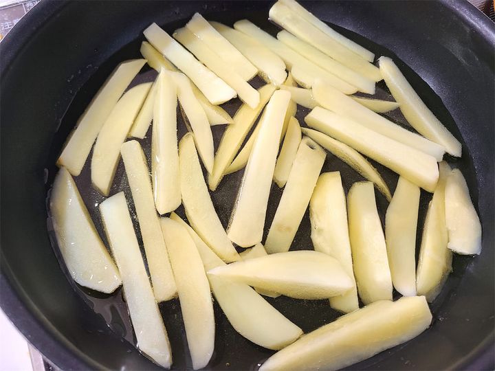 5.  冷やしておいたじゃがいもを油を入れていない状態のフライパンに並べ、じゃがいもが浸るくらい油を注ぎます。その後、弱めの中火で加熱します。