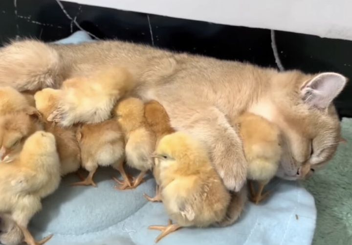 3. ヒヨコをハグしながらお昼寝する猫さん♪