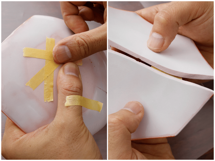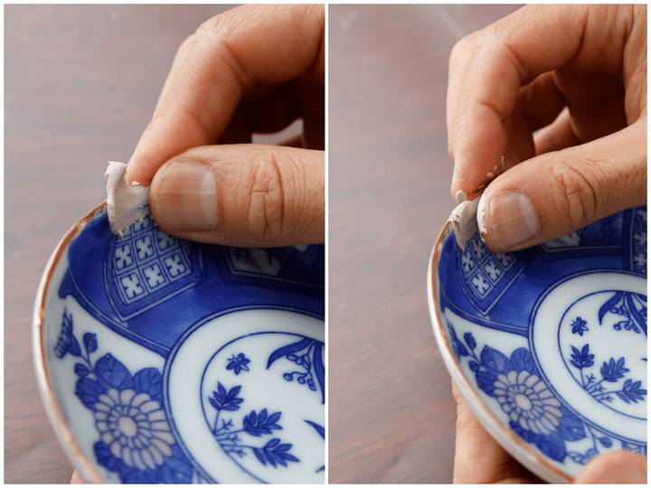 マスキングテープをいくつかちぎって手の甲などに貼り、器の裏側からテープで仮留めする。割れ目全体に貼るのではなく、1カ所支点となるところを決め、横、斜めに貼るとよい。