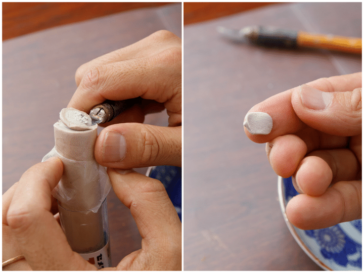 薄め液は濃度を見ながら1~2滴ずつ入れていく。 スポイトか竹串を伝わせて少しずつ入れる。小皿は裏面の底に丸めたマスキングテープなどを使って傾斜をつけると、少ない塗料を効率よく筆につけることができる。