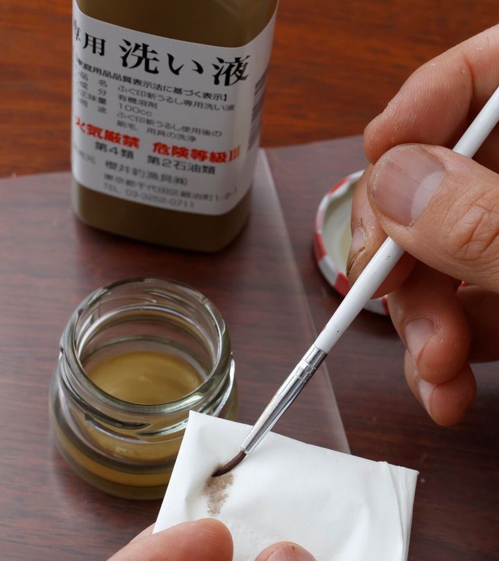 洗い液は少量を小びんなどに移しておくと便利! ペーパーなどでかるく水分を落としてからしまって。残った洗い液は密閉して保存。小皿に残った金うるしはペーパーで拭き取って。