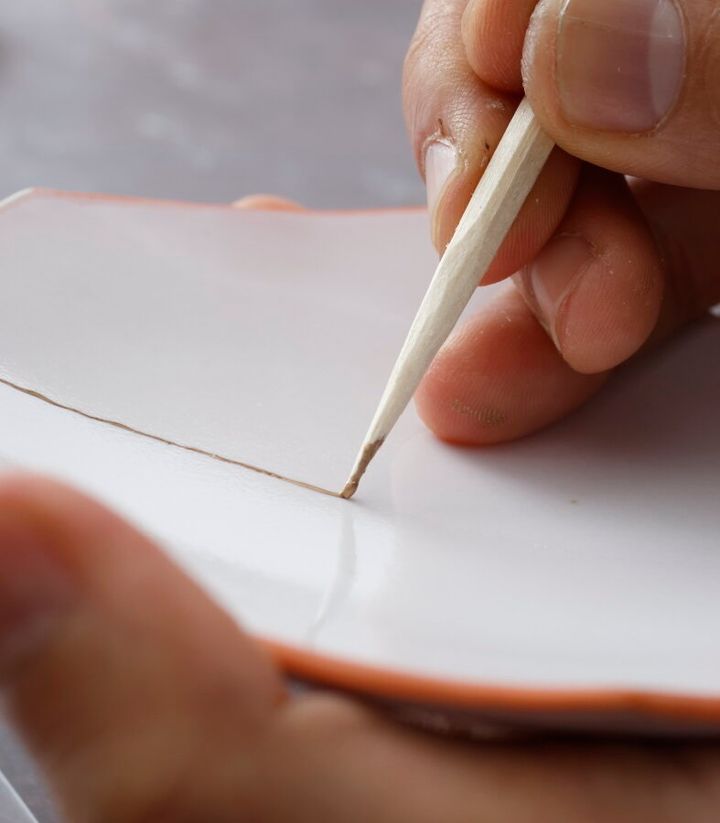 真っ二つに割れた皿など、  まずは割れのパーツが大きいものから始めるのがおすすめ! 細い線を描くので 、硬い木製筆で作業するとよりきれいに仕上がりますよ。