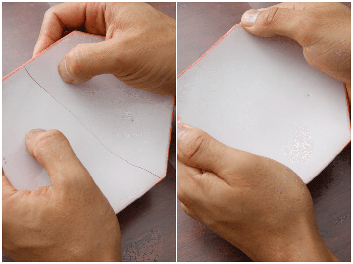 ※作業をする際は、下にクリアファイルを敷きます。新聞紙や布だと、補修中の器を置いた際にくっついてしまうことがあるので注意! クリアファイルはA4サイズを切り開いてA3サイズにすると作業しやすいですよ。