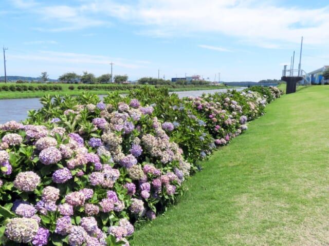 栗山川の土手エリアには約1万株のあじさいが植栽されており、例年6月中旬に見ごろを迎えます。
