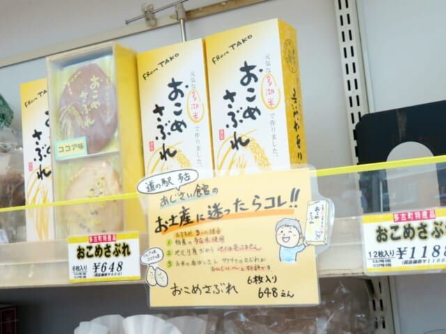 「おこめさぶれ」は、高級感たっぷりの米のサブレで、表面の多古米の粒がアクセントになっています。お土産に困ったときの定番となるかもしれません。