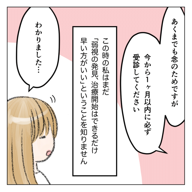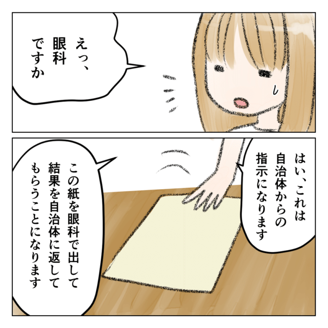 自治体からは「1ヶ月以内にきちんと眼科で診てもらって検査報告を自治体に送る」という指示の書かれた書類を受け取ります。