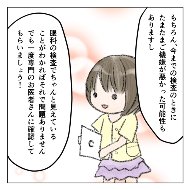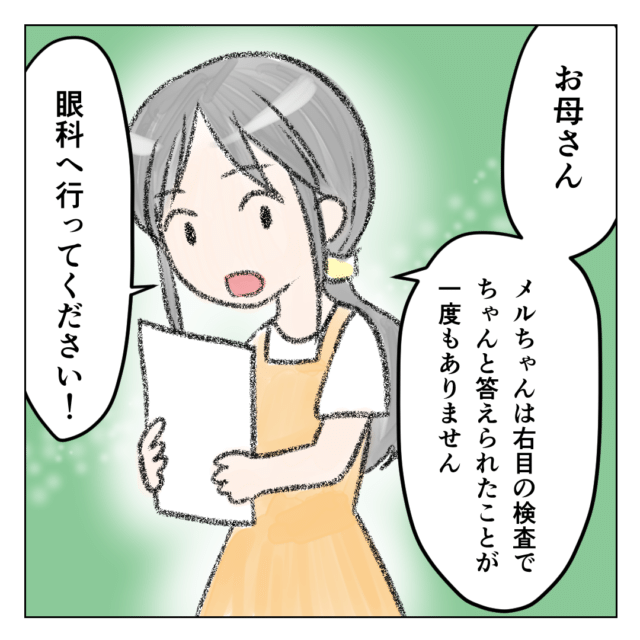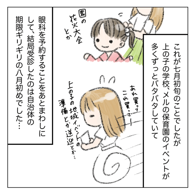 ここでも母はまだメルの視力が低い可能性すら考えていませんでした。上の子の小学校関連の行事も重なり、眼科を予約できたのは自治体の期限ギリギリになってしまいました。