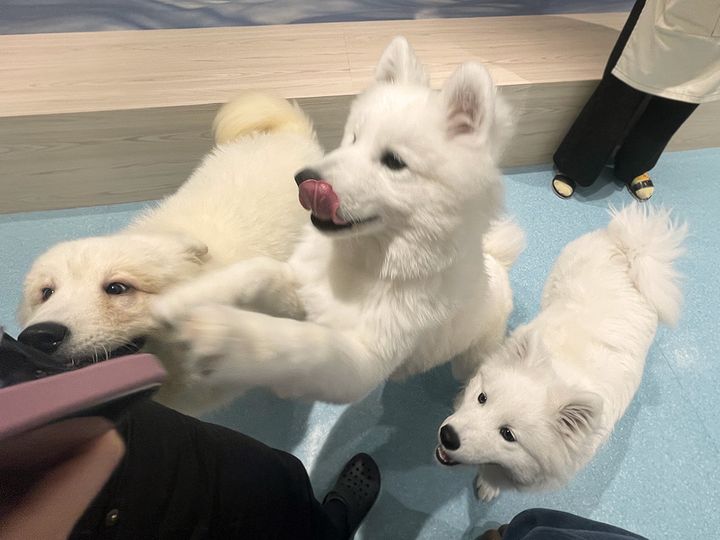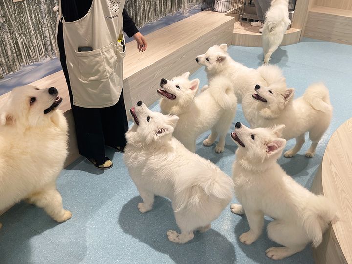 上板橋店には、8匹のサモエドがいます。生後半年ほどの6匹(写真に写っている子たち)と、最近韓国から引っ越してきたという成犬2匹。