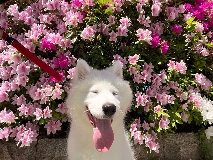 シベリア出身の大型犬であるサモエドは、モッフモフの白い毛と大きな体が特徴。とても温厚で甘えん坊な性格が魅力です。