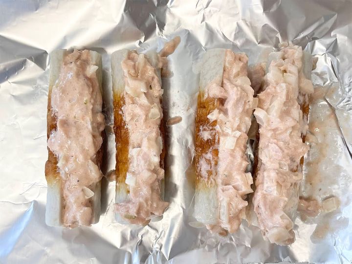 1.  アルミホイルの上にちくわを並べ、その中に事前に混ぜておいたツナマヨを詰めます。