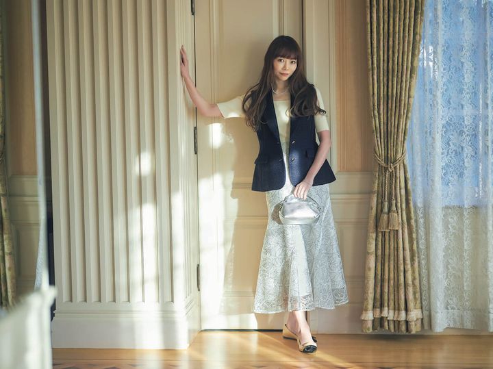 ジレ¥20,900/アプワイザー・リッシェ ニット¥14,960/アンクレイヴ ホワイト/アンクレイヴ(オンワード樫山) スカート¥24,200/マイストラーダ バッグ¥41,800/Epoi(エポイ本店) シューズ¥140,800/セルジオ ロッシ ネックレス¥14,300/ヴァーミリオン(ヴァンドームヤマダ) ブレスレット¥29,700/プラス ヴァンドーム