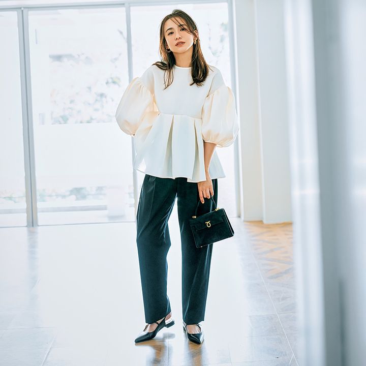 ブラウス¥19,800(へヨン)パンツ¥53,900(ATON/エイトン青山)イヤリング¥16,200(アビステ)バッグ¥418,000(ロウナーロンドン/エイチアイティー)靴¥39,600(ファビオルスコーニ/ファビオルスコーニルミネ有楽町店