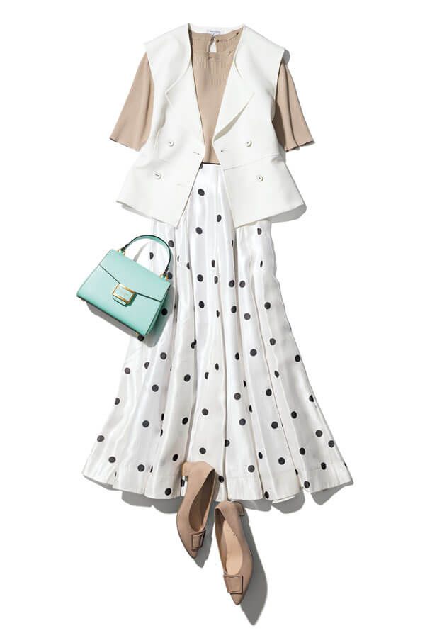 きれいめStyle:ジレとスカートを白でそろえてセットアップ風に