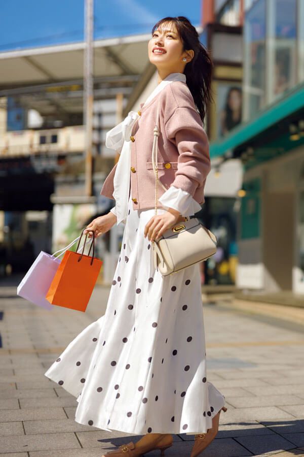 清楚な大人女子を気取る王道トップスと言えばコレ! 白の純真無垢なイメージと、ボウタイのクラシカルなきちんと感を両取り。白ブラウスのレフ板効果で顔色をトーンアップしつつ、くすみピンクのニットジャケットで甘めな華やぎを追加。ドラマチックに揺れるドット柄スカートとの合わせで、美人ムードを高めて。