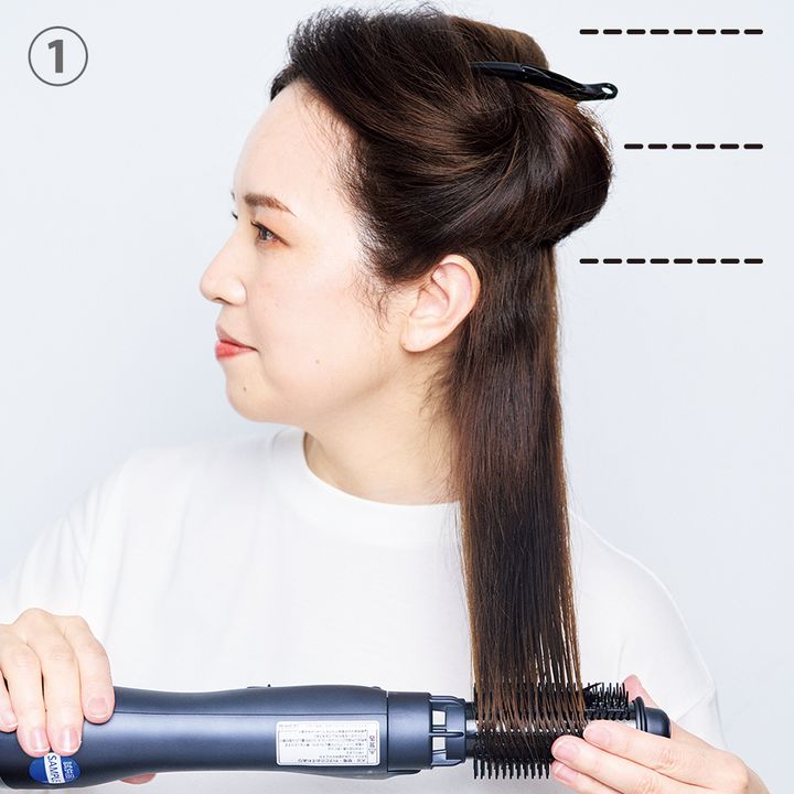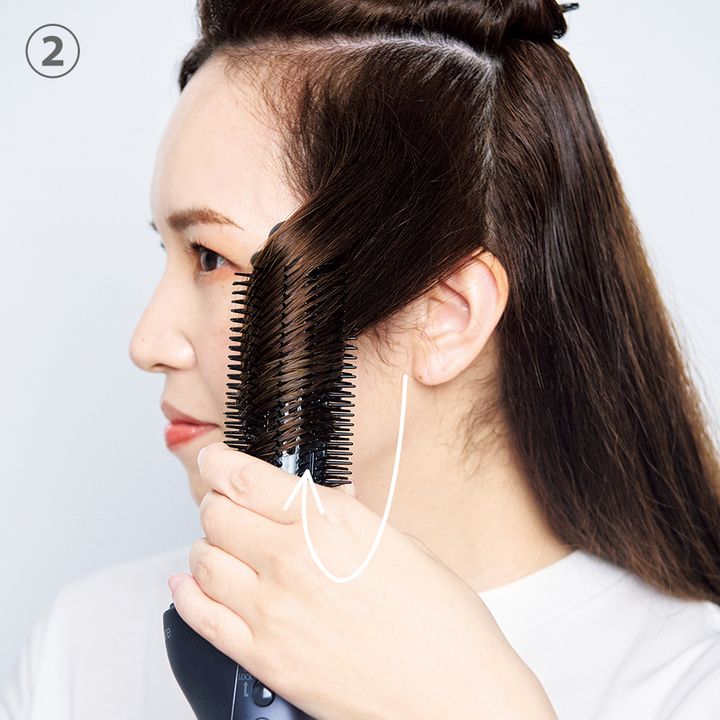 耳前上部の髪は、ドライヤーを斜め45度にし、髪を引っ張りリバースでぐるぐる巻きに。でき上がったカールは②と合わせ手でほぐします。
