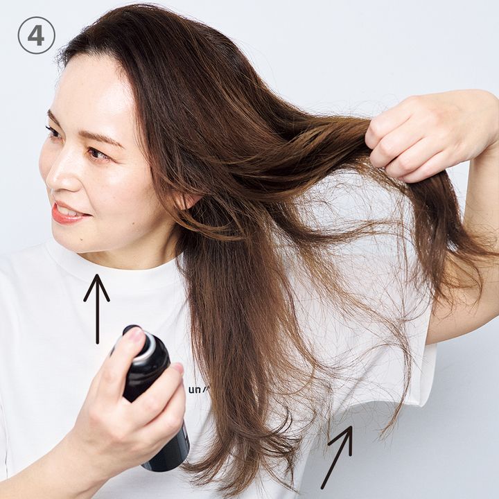 ほぐした髪を大きくつかんで、パラパラ落としながら、下からあおるようにスプレーして、髪全体にスプレーが回るよう意識します。