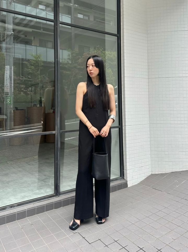 シルエットの美しさを生かしたシンプルモードなオールブラック。「アメスリで女っぽくモードな印象のオールインワンは、デザイン性はありつつもシンプルなので存在感のあるアクセサリーをつけてコーディネート。麻の感じも出しながら、シワになりにくく取り扱いやすい点も◎」