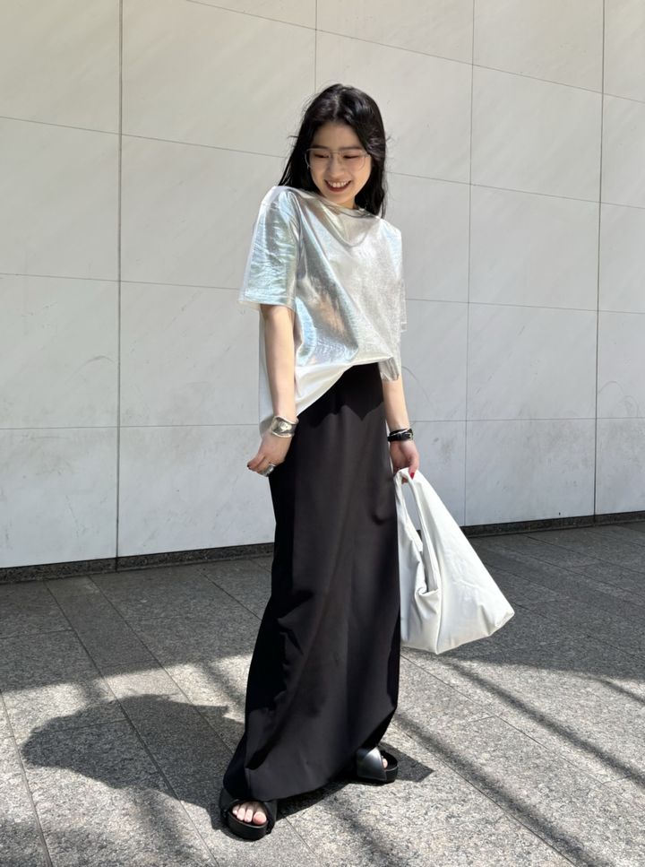 ブラックのロングスカートは箔加工のTシャツで軽やかさを。「身長が153㎝と小柄なので夏のモノトーンは黒の分量が多過ぎないようにバランスを重視。小物はシルバーとモノトーンで統一してスッキリと見えるようにまとめました」