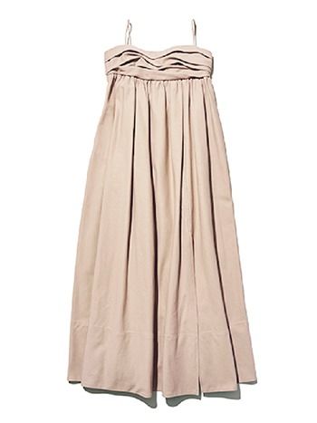 ベージュビズミーワンピース/カオス(カオス丸の内) 立体裁断で作ったドレープが美しい、コットンビスコースチノを使用。ハリ、ツヤ、シャリ感をそなえた生地で、Tシャツなどと重ねても質感にメリハリがつき、単体でもペラっと見えず凛としたたたずまいに。