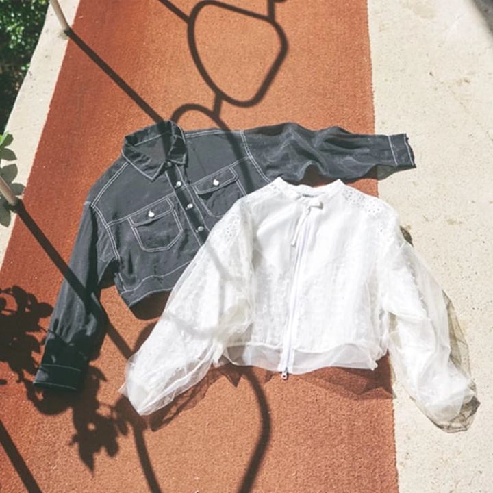 〈右〉シアーブルゾン 21,780円/Cepica(ジオン商事)〈左〉ステッチシアーシャツ 3,299円/Figments