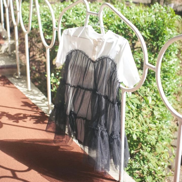 ブラックチュールからのぞくシャツが新鮮。涼しげなモノトーンコーデに♡