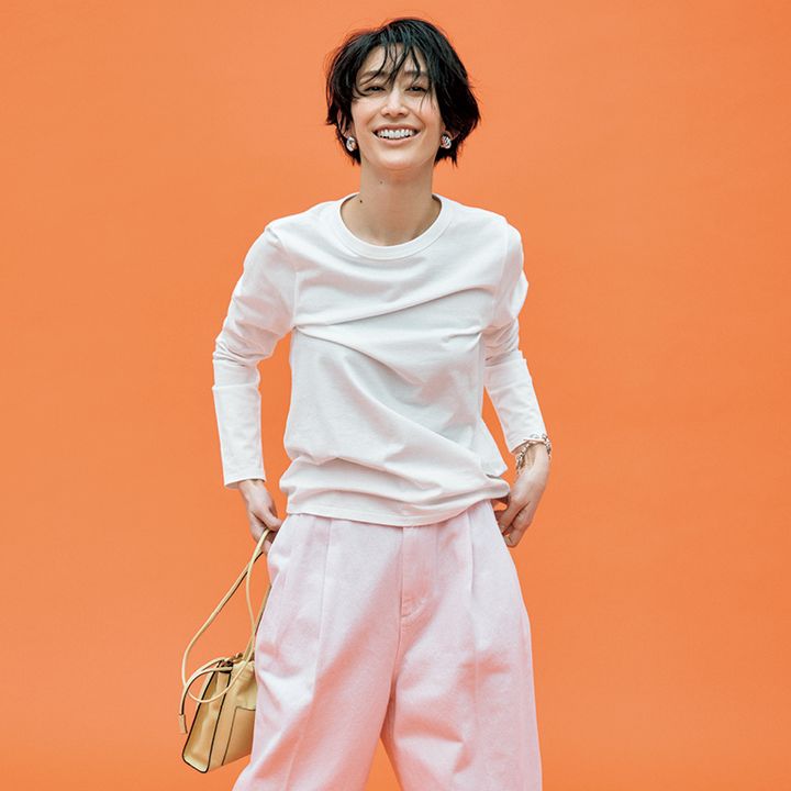 コットンTシャツ¥8,690(WRAY)デニムパンツ¥21,890(アンクレイヴ ホワイト/オンワード樫山)イヤリング¥8,800(アビステ)ブレスレット¥9,900(イン ムード/フォーティーン ショールーム)バッグ¥34,100(オルセット/オルサ)
