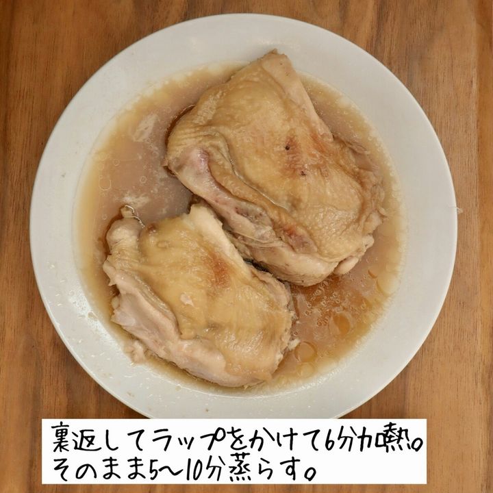 裏返した、ラップをかけて6分加熱し、そのまま5~10分蒸らします。加熱不十分な場合は、追加で加熱してください。