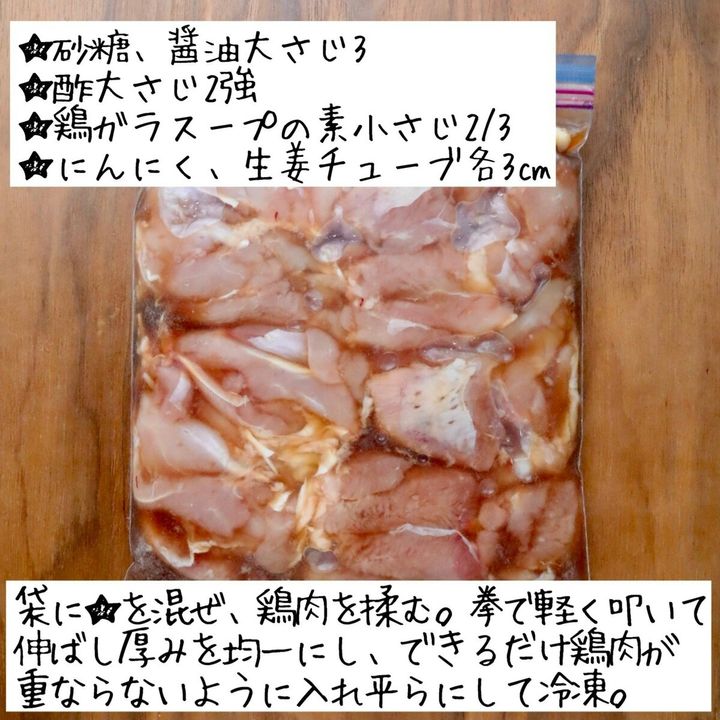 保存袋に★を入れて混ぜ、鶏肉を加えて揉む。てのひらで軽く叩いて伸ばし厚みを均一にし、できるだけ鶏肉同士が重ならないように入れて空気を抜き、平らにして冷凍。