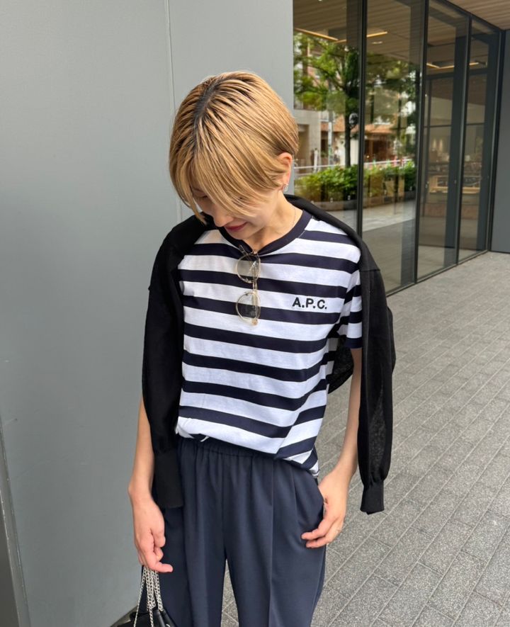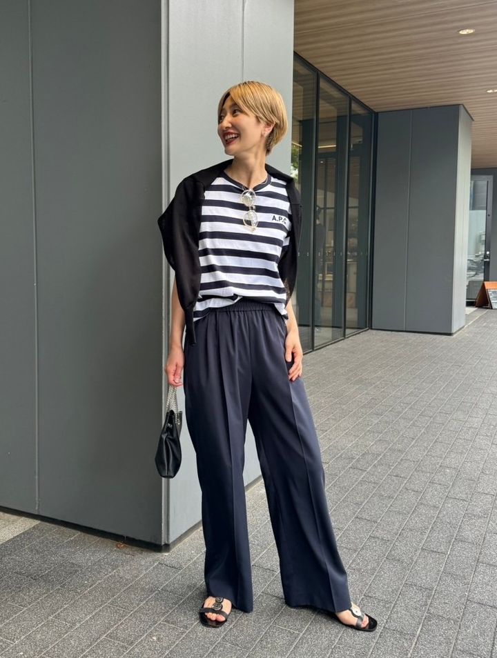 「ボーダーTを大人っぽく着たいなと思い、Tシャツと同トーンのとろみのあるパンツを合わせました。小物はブラックでまとめて引き締めつつ、肩掛けのカーディガンはシアーを素材を選ぶなど、全体が重たくならないように工夫しました。また、サングラスはクリアフレームにして夏っぽさをプラスしています」
