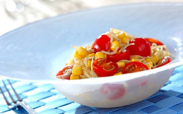 これからの季節にうれしい冷製パスタです。スパゲッティーは冷やしたときに固くなりやすいので指定時間より1分ほど長めに茹でます。あとは具材を混ぜるだけで完成。ポン酢しょうゆでさっぱりといただきましょう!