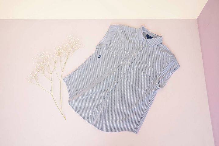 上司や目上の人とのラウンドにイチ押しの、きちんとパンツルック。ブルー系ストライプと白の組み合わせで清潔感MAXに。シャツのやや長めの丈感は、ウエストやヒップラインをカムフラージュしてくれる効果も◎。