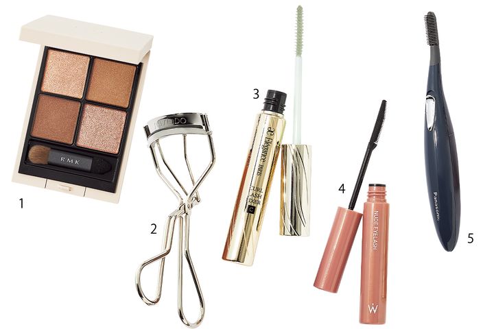 アイテムの2で根元を立ち上げ、中間・毛先にもカールをつける。3を塗って乾かす間にアイラインを入れ、乾いたらコームでとかすように4を上下に塗る。他のメイクをし、4が乾いたら5でさらに根元を上げる。