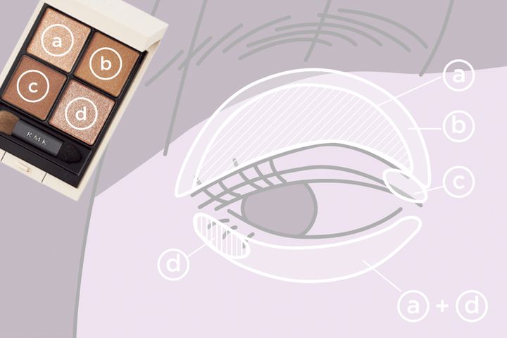 aをアイホール全体に塗りツヤをプラス。bをまつ毛のキワからアイホール全体に重ね、cを上目頭にチップ幅に。下まぶたは全体にa+dを入れ、dを下目尻に塗って影をなくし、涙袋を強調。