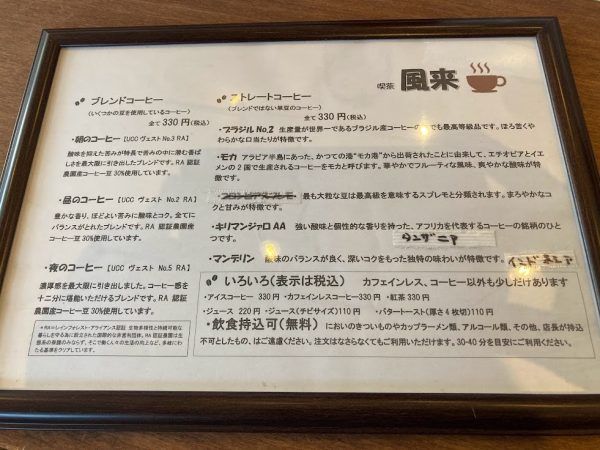 「喫茶風来」さんでは店主さんの入れた本格コーヒーが各種330円でいただけます。コーヒーが飲めない方には美味しい紅茶やジュースも!しかも、お子さん連れの懐にとっても優しく、チビサイズのジュースは、なんと110円です。