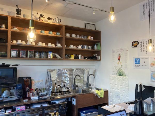 店内はカウンター、そして棚には素敵なカップが飾られています。